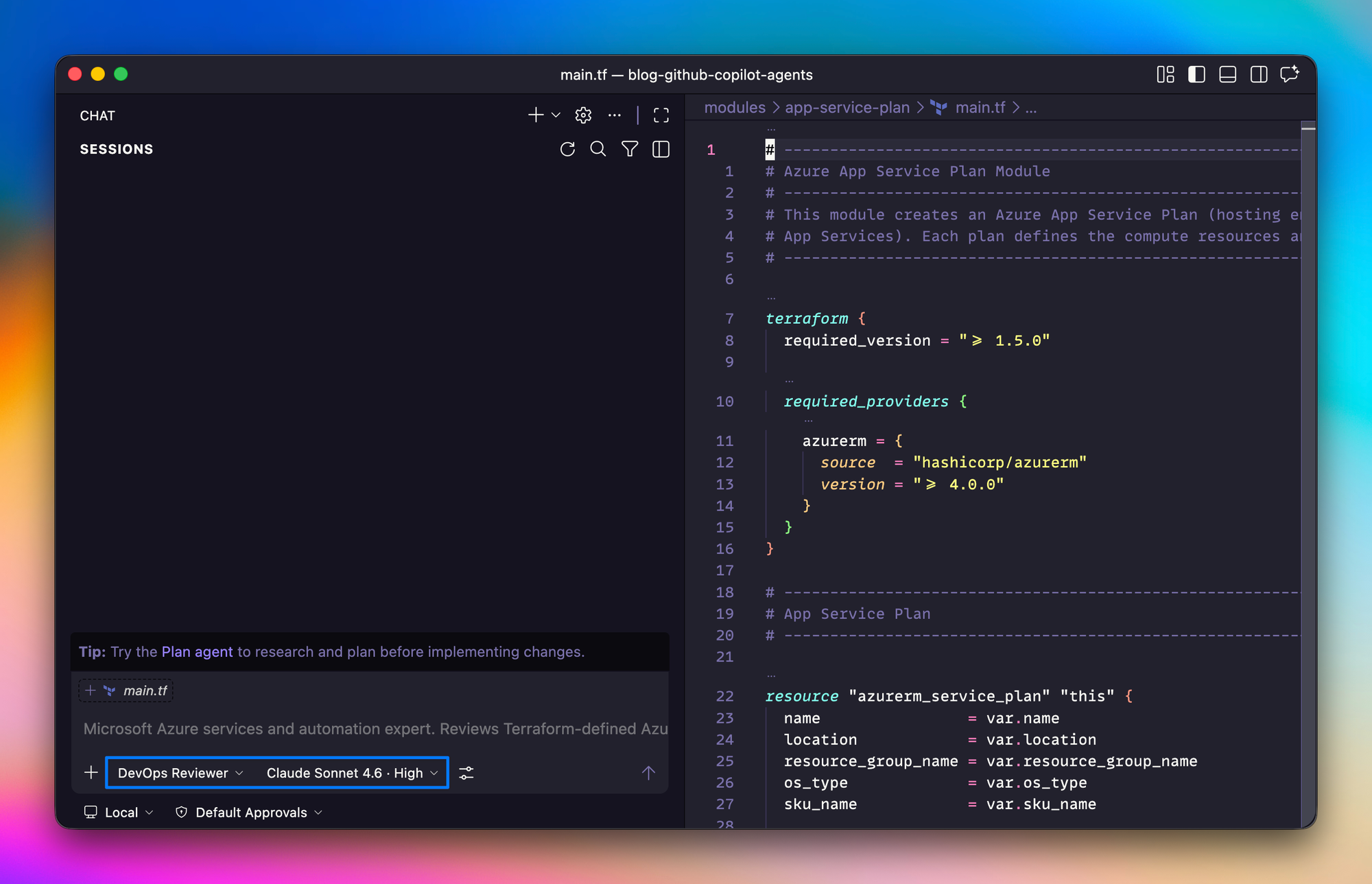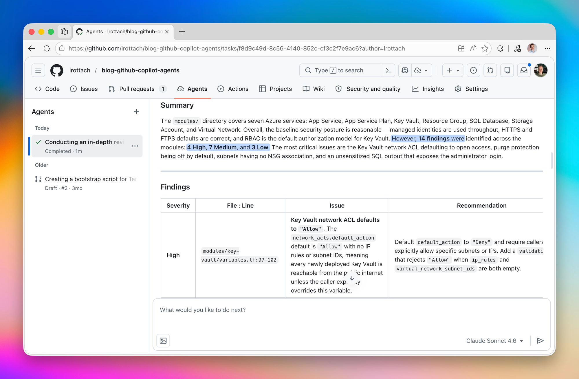 Another use case is where the auto-invocation setting from the frontmatter really starts to pay off. For example, you ask Copilot to build a new Terraform module, say a storage account with customer-managed keys and a private endpoint. Once the implementation lands, Copilot can hand the result straight to your Security Reviewer and DevOps Reviewer without you swapping contexts or remembering to run them manually. Build, review, repeat, all in the same chat. Copilot does the typing, the agents double-check the work, and I spend my time on the decisions that actually need a human.
